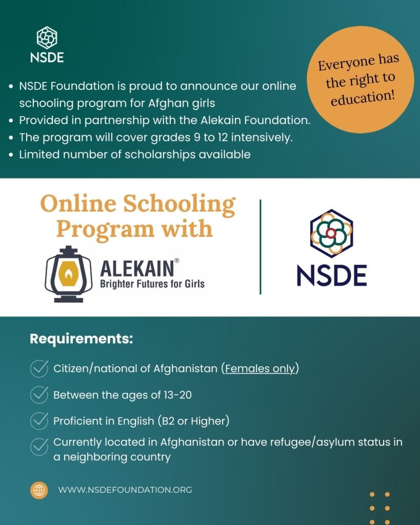 NSDE Foundation is expanding access to education for Afghan girls through a renewed online schooling model in partnership with Alekain Foundation. Together, we offer eligible students the opportunity to continue accredited, online secondary school education through Alekain’s program delivered by Smart Schools International, a fully accredited online high school.